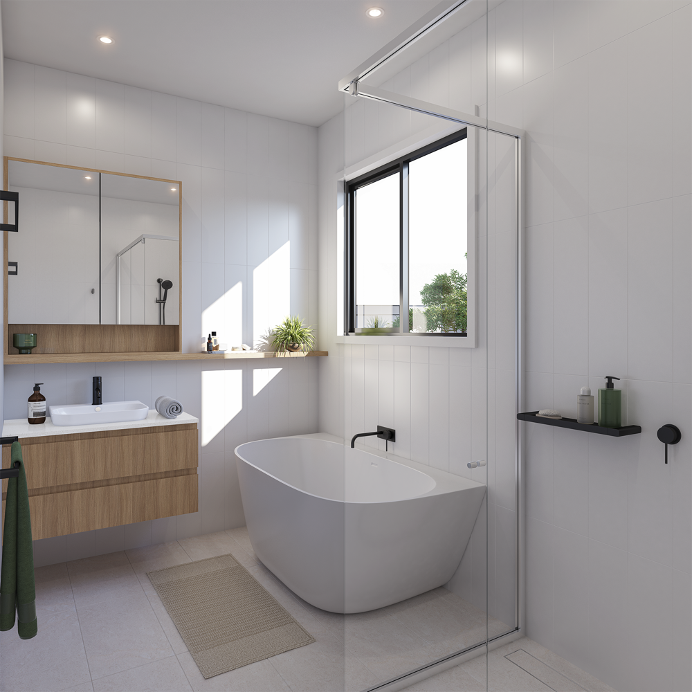 Matte black hardware and shower screen frames where applicable.